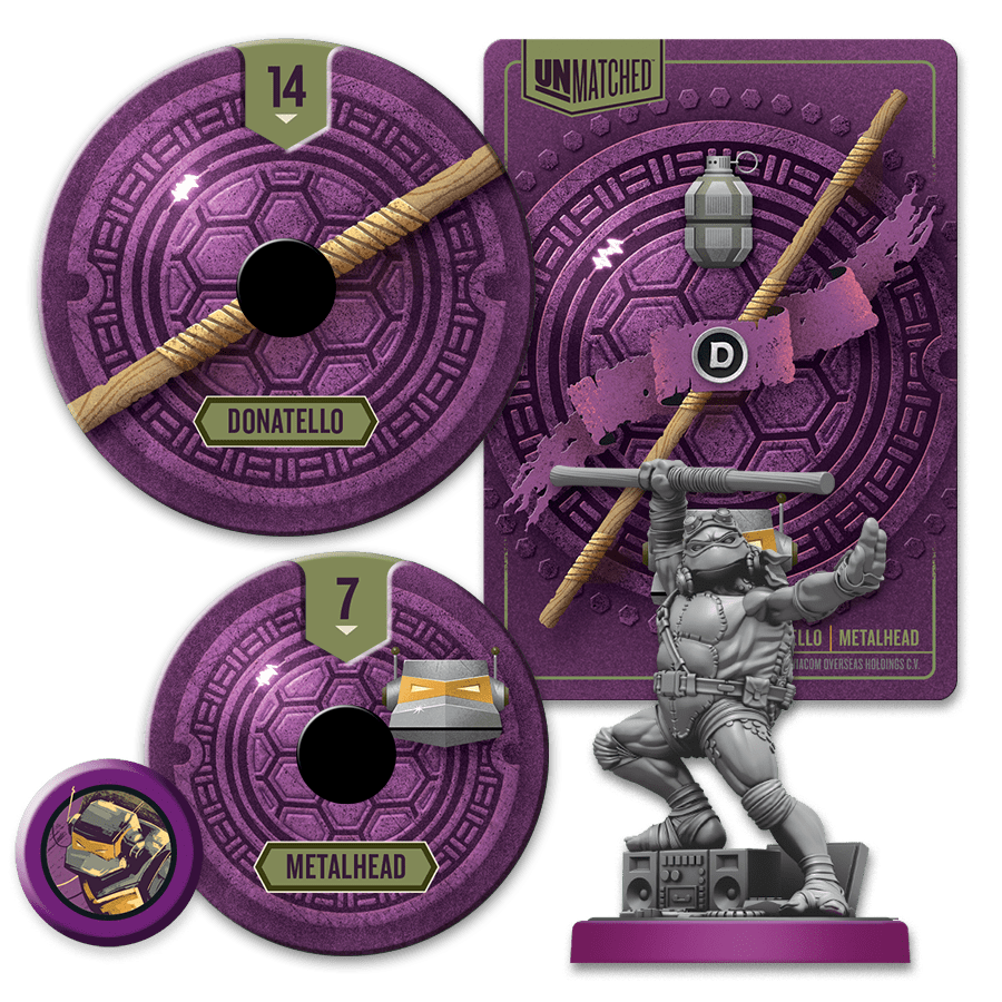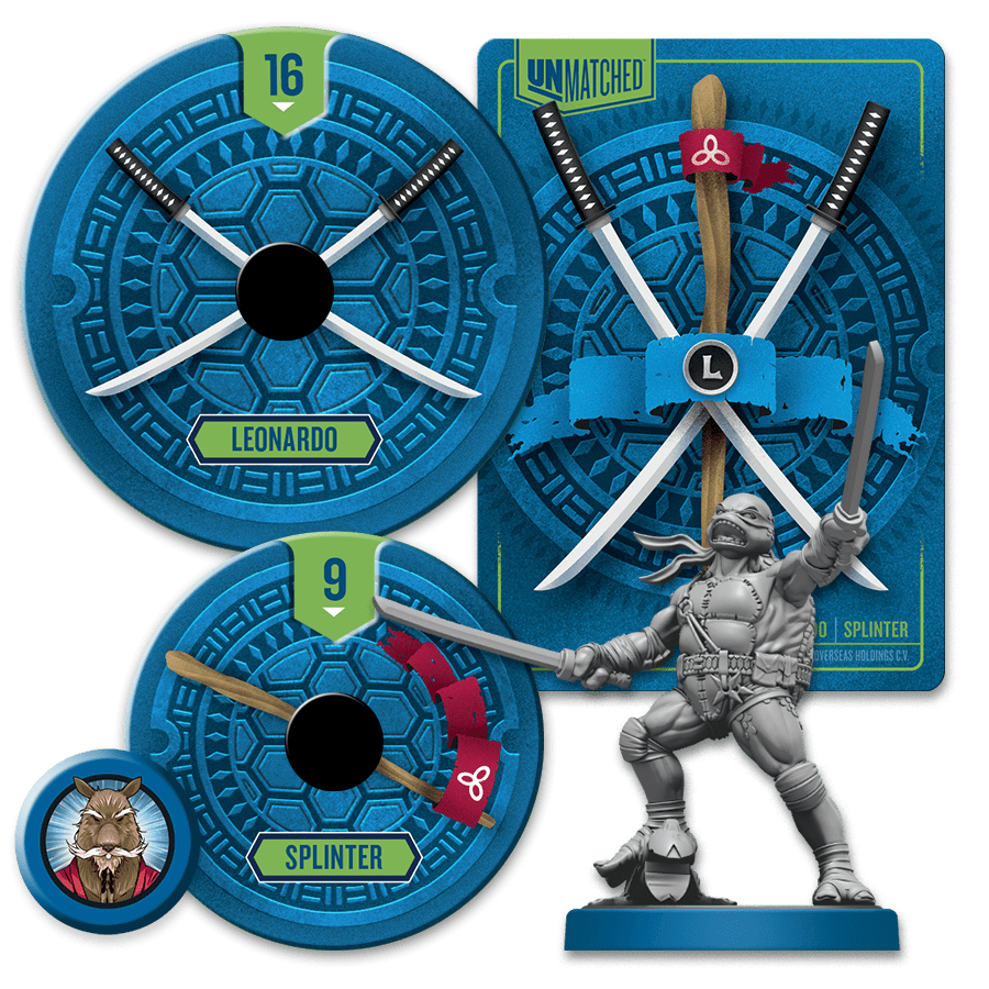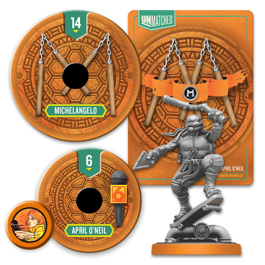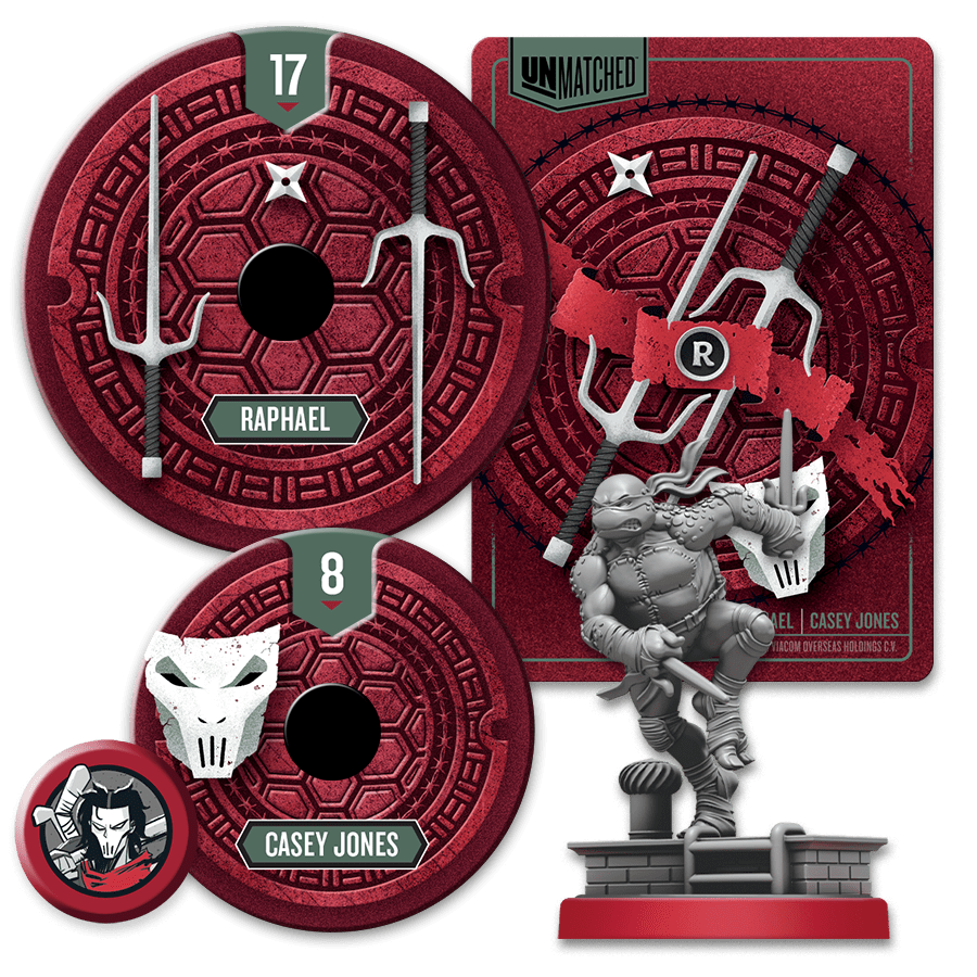 The Teenage Mutant Ninja Turtles are coming to Unmatched. Raphael attacks with ferocity, hitting back harder when he gets hit. Michelangelo doesn’t have much of a plan, but he’s got the energy to keep up the attack. Donatello uses his nifty machines to gain an edge. Leonardo controls the battlefield with clever positioning and planning. And they’ll need to work together to save the day! As with every Unmatched set, these heroes can fight each other in the competitive game or challenge heroes from any Unmatched set.